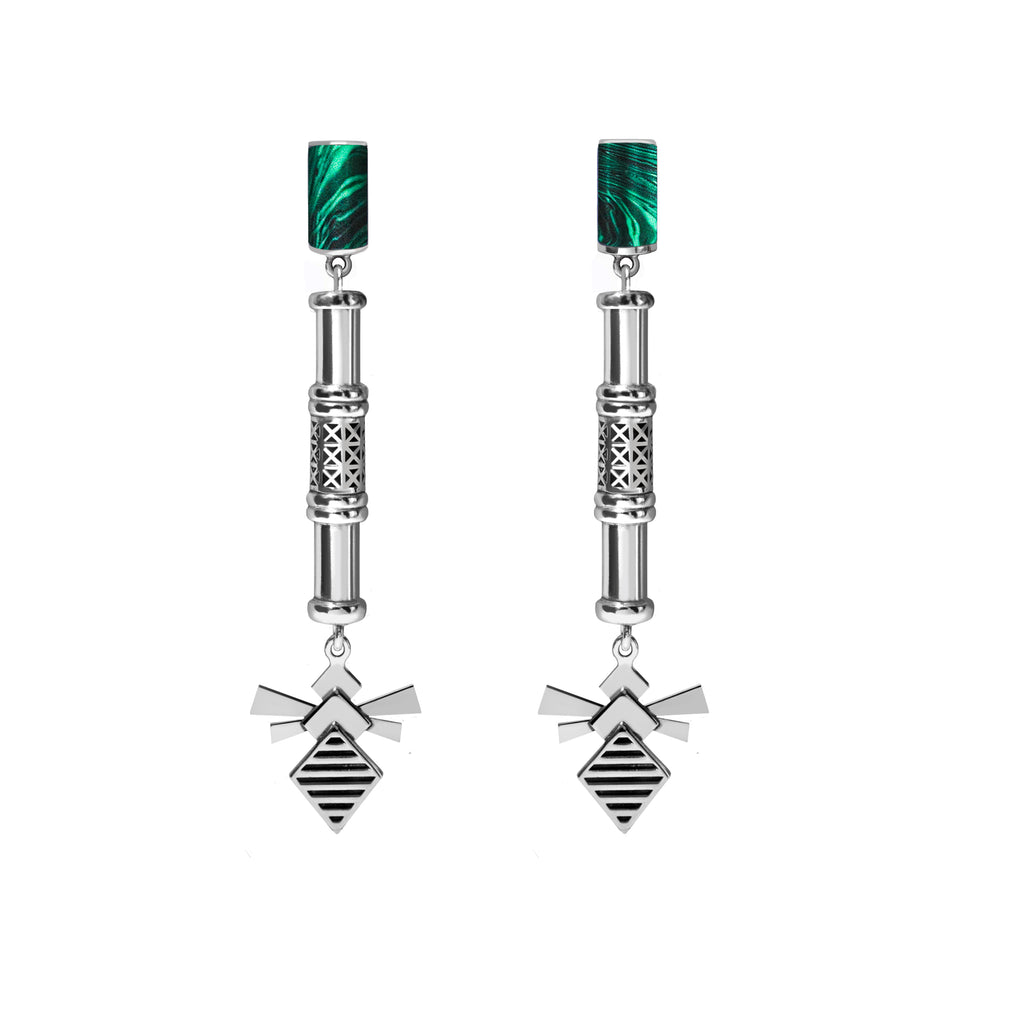 The Bamboo Earrings envision a bamboo tree growing right through a billboard assemblage, fueled by the power of a bee. A billboard pattern is crafted on the bamboo silhouette to symbolize man-made structures becoming one with nature, as plants and bees unite to reclaim power