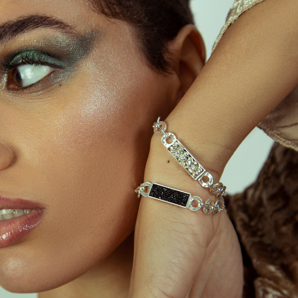 Holding our signature crushed stone technique and a hammered texture, The Melanin Bracelet now mimics the surface of a pool. As a call for disconnecting to reconnect, the pool symbolizes relaxation and reflection, highlighting the importance of leisure time for a person's well-being. Tones of a pool during daylight are reflected through the aquamarine Kyanite stones, sunset hues are reflected through the purple Amethyst stones, and late night tones are reflected through black Onyx stones.