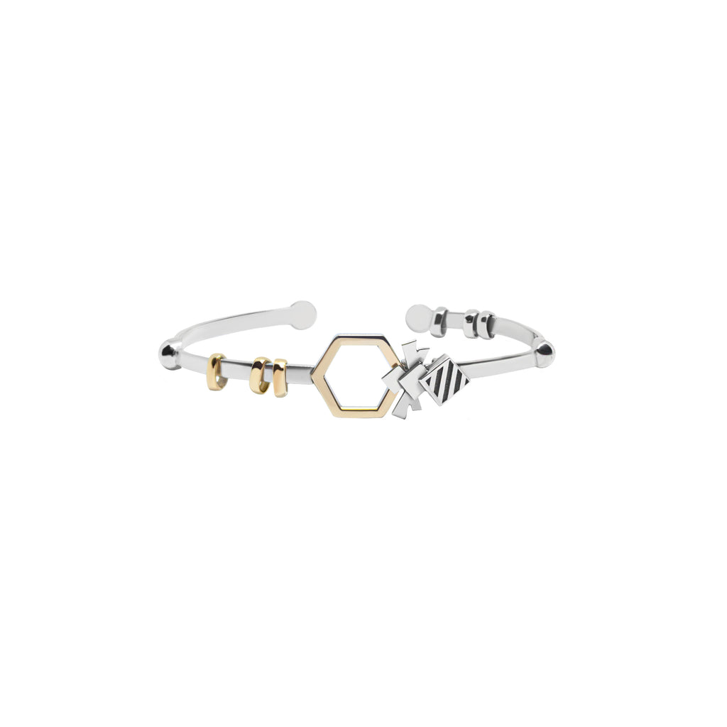 Designed to be lightweight and fun, the Pollen Bracelet holds Sandbox's staple Bee design, three silver rings, and three 18KT gold rings which all playfully move back and forth on the bracelet! In the middle, an 18KT Gold hexagon drawn from the texture of a beehive, gives the bracelet dynamic.