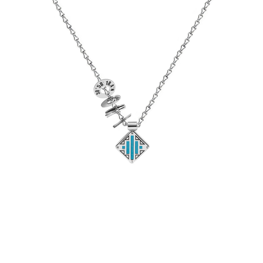 Adding dynamic to the necklace, the pendant is double-sided, holding a compass design on one side, and the Sandbox emblem in the form of an Onyx stone, a Turquoise stone or a Blue Mother of pearl stone on the other.