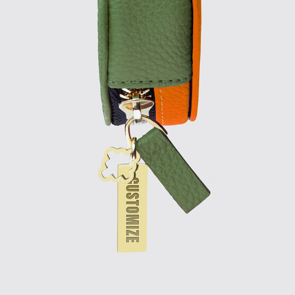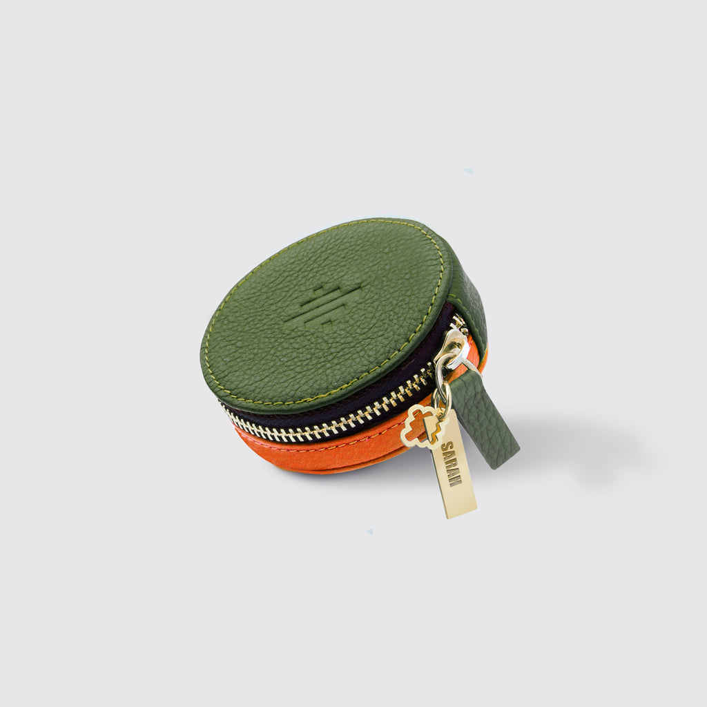 Crafted from a playful fusion of cactus green and orange cowhide leather, beige shamoa, and brass accessories, the Throw & Go Jewelry box is designed to be customizable and able to fit into the smallest of bags. Whether it be by the beach, at the gym, or in your luggage, this jewelry box is ready to accompany you wherever you may wonder.