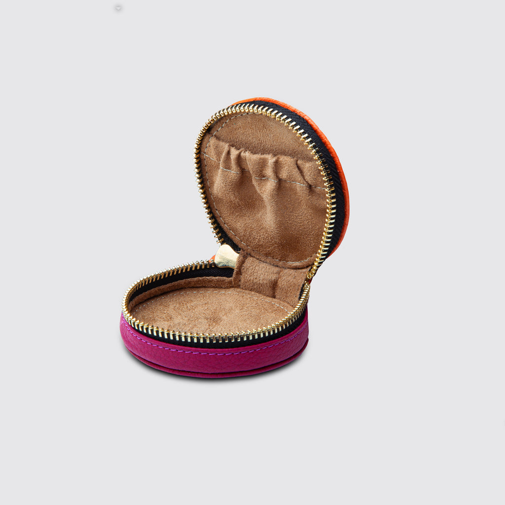 Crafted from a playful fusion of orange and fuchsia cowhide leather, beige shamoa, and brass accessories, the Throw & Go Jewelry box is designed to be customizable and able to fit into the smallest of bags. Whether it be by the beach, at the gym, or in your luggage, this jewelry box is ready to accompany you wherever you may wonder.