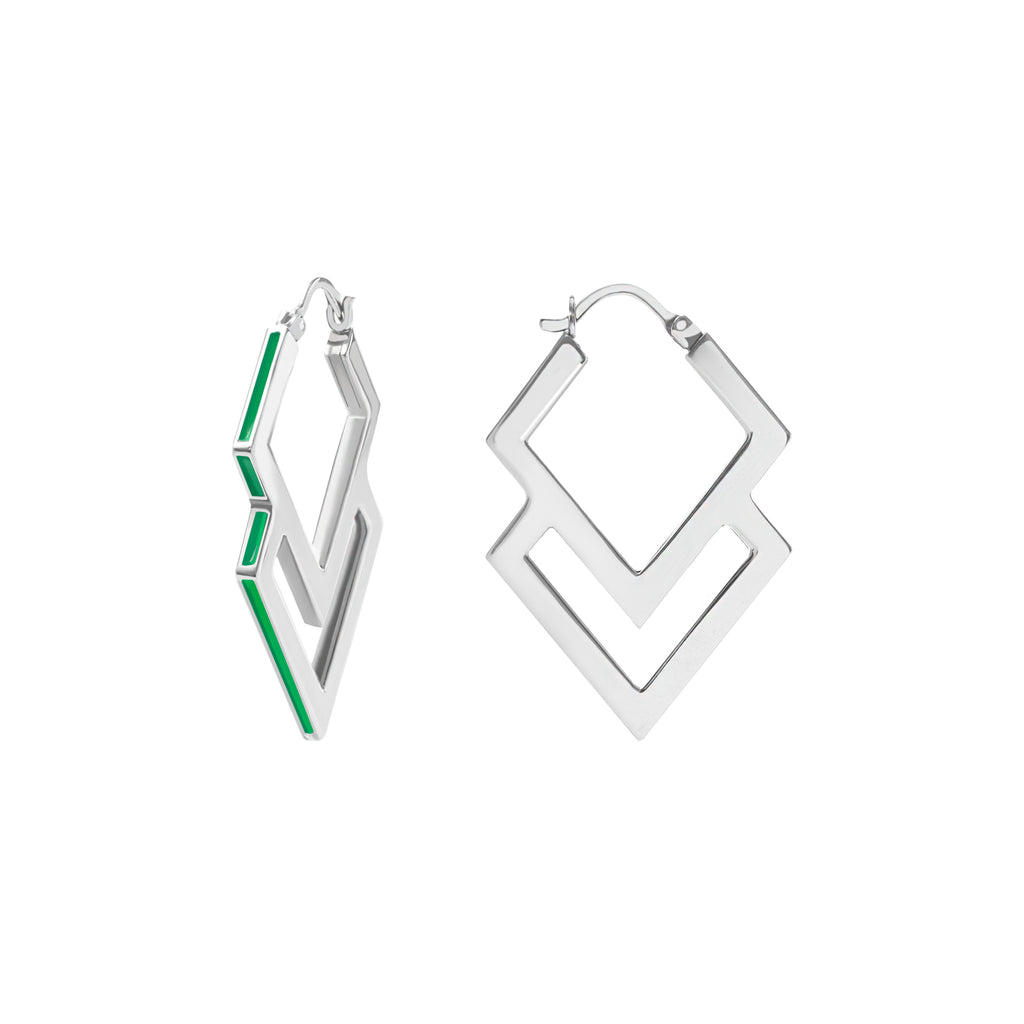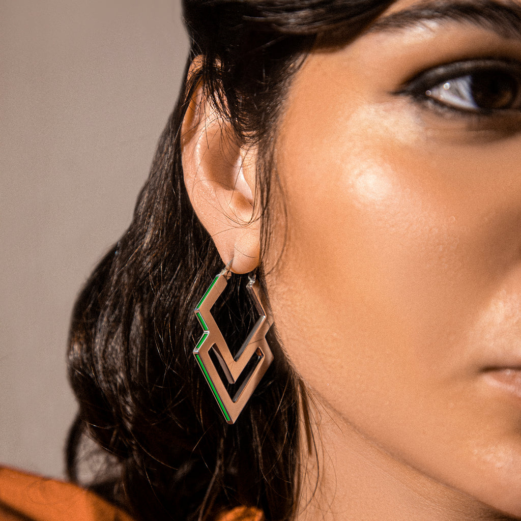 The Mashrabeya Earrings are a quiet conversation between tradition and modernity. Inspired by the Mashrabeya, the ornate latticework that has graced Middle Eastern architecture for centuries, their double-rhombus cutouts echo the intricate geometry and airiness of timeless architecture. A whisper of enamel flows down the sides, offering a glimpse of color, as if to reveal hidden stories.