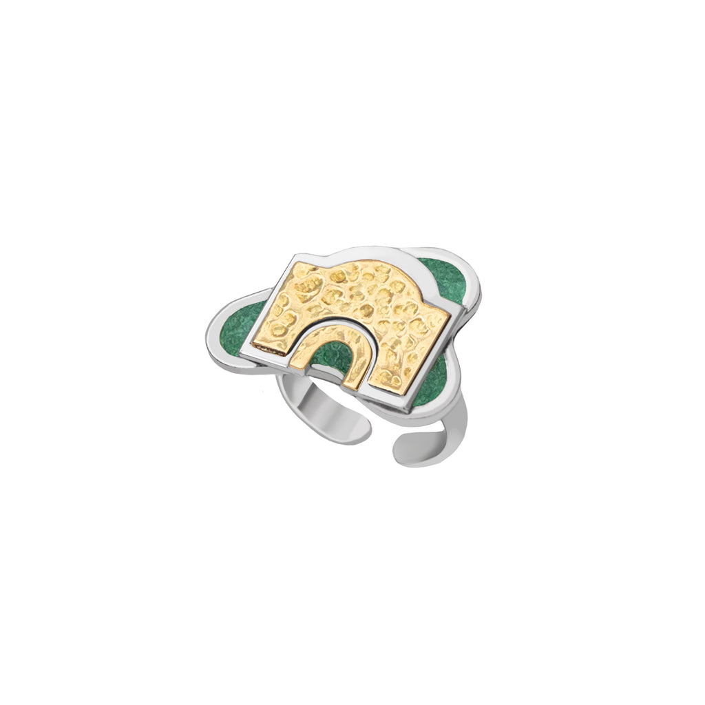 Designed in collaboration with interior design house Sherine Mahgoub, the Nuba Ring comes in 2 different material fusions. The first being sterling silver, brass and blue kyanite stones, and the second being sterling silver and black onyx stones. The choice is yours!