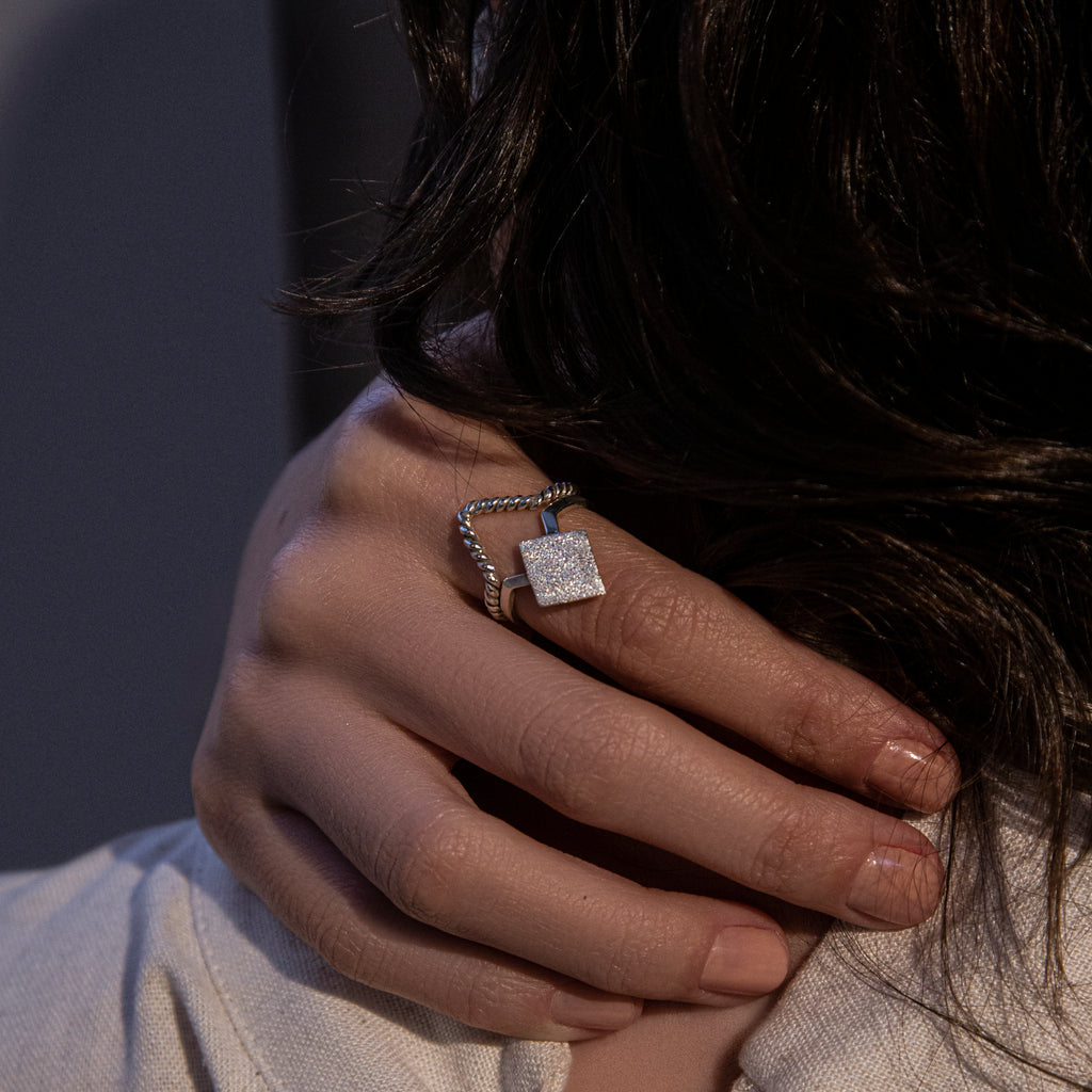 The Mashrabeya Ring Set is a tribute to the intricacy of the Mashrabeya, the ornate latticework that has graced Middle Eastern architecture for centuries. When worn together, the rings form a double-rhombus shape, with one rhombus featuring a seemingly cutout design that mirrors the delicate lattice, while the other showcases an intricate sandy texture, capturing the essence of desert winds and sun-kissed stone.