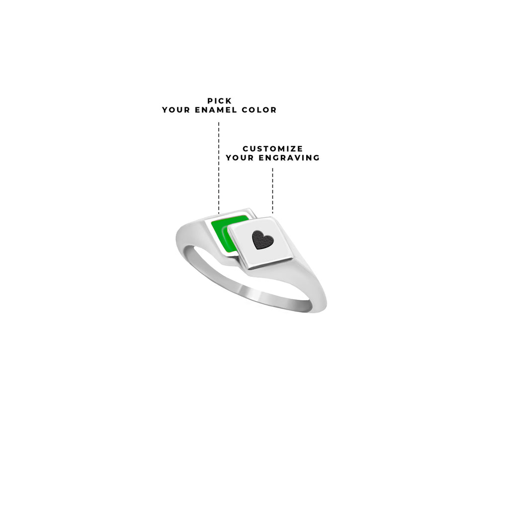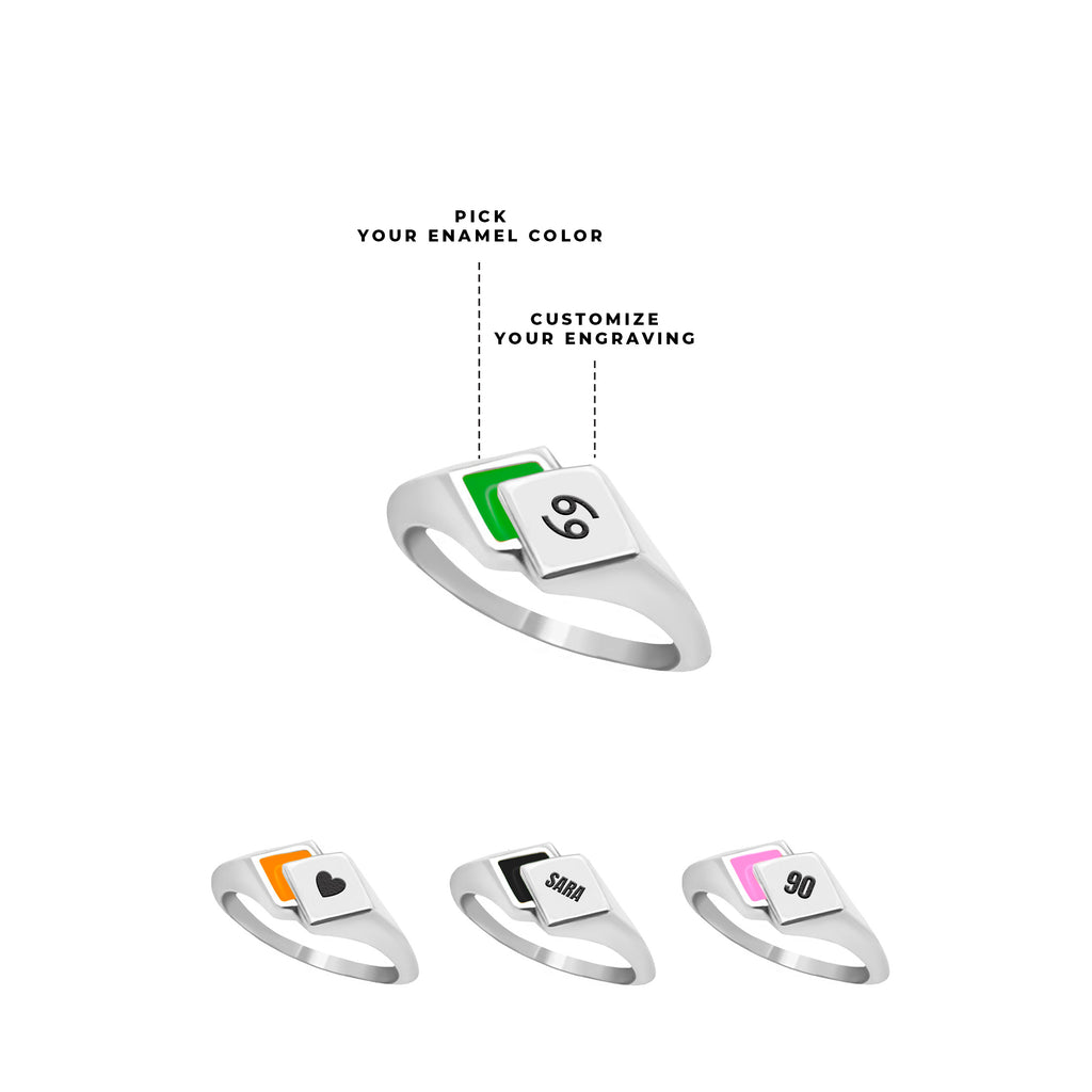 Crafted from sterling silver and enameling, with a customizability feature, this ring offers a canvas for your personal narrative. Choose your color, and combine it with the symbol, letter, or short word of your choice. As a piece of history, interpreted with a modern and playful take, this ring offers endless possibilities, painted in your own personal story.