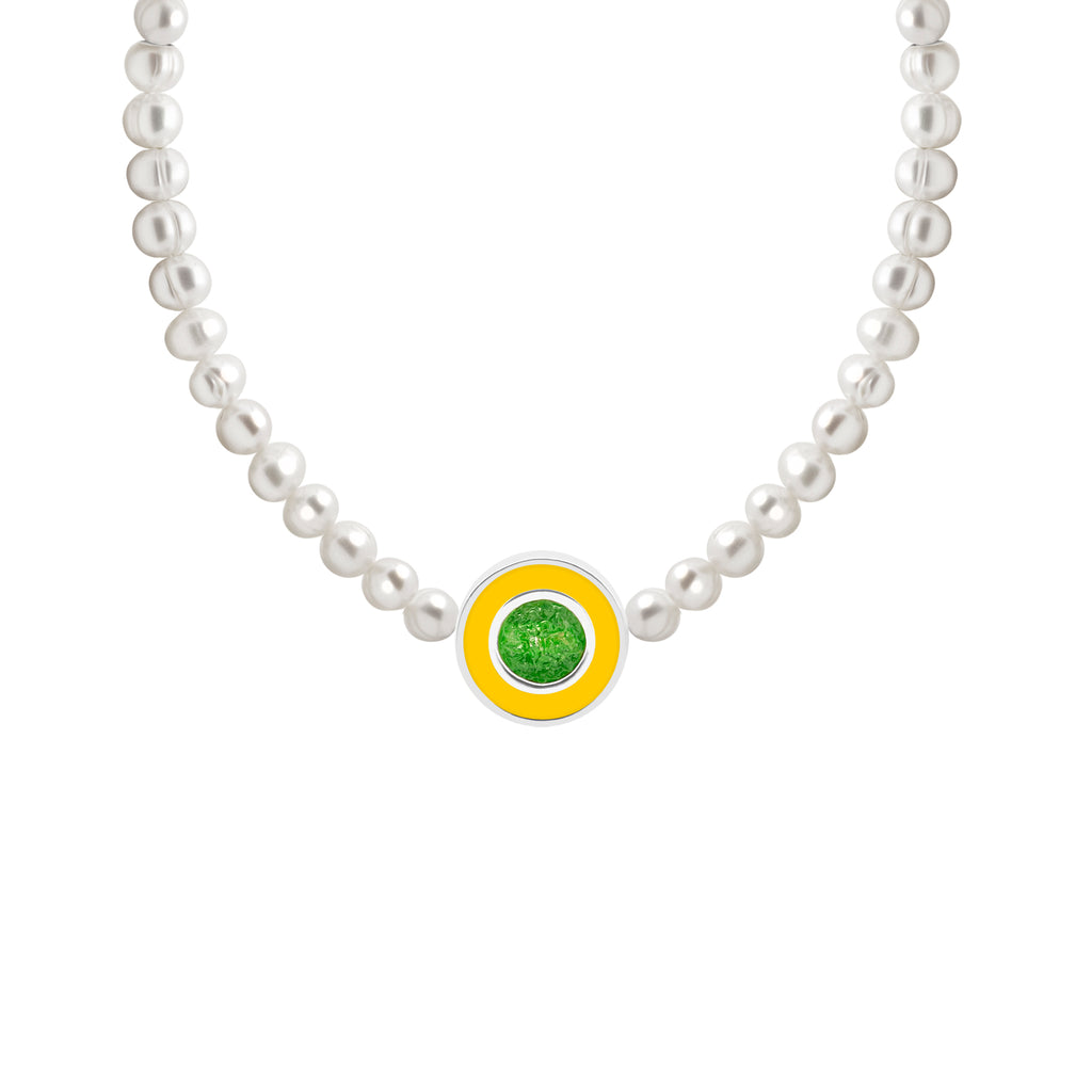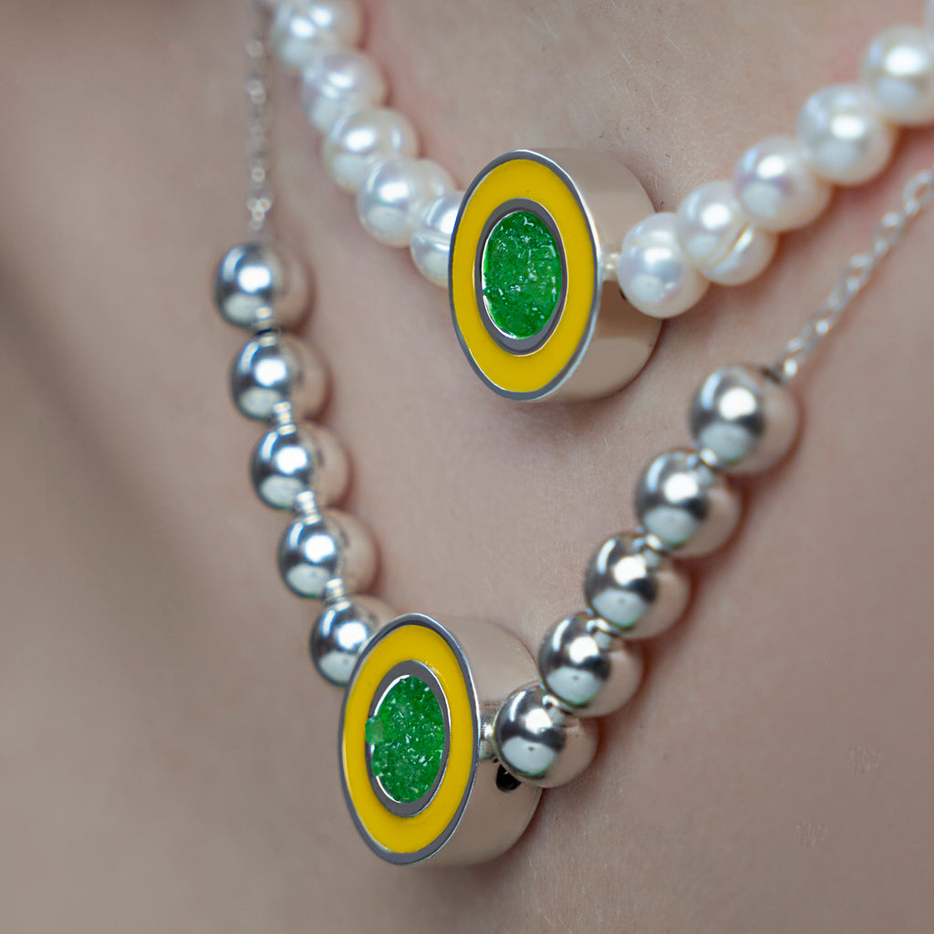 Sip back and enjoy the fun! The Lemon-Mint Slush Necklace, envisions Sandbox's signature crushed stones as a lemon-mint slushy, with a dash of milk. Capturing the colors of lemon with mint and milk, a sterling silver center piece holds green jade stones framed by yellow enameling, and is set nicely in the middle of a string of white cultured pearls.