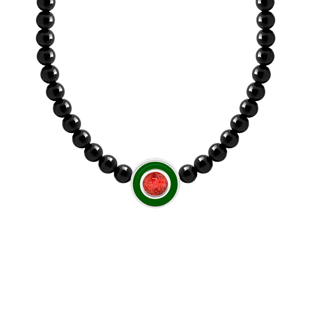 Sip back and enjoy the fun! The Watermelon Slush Necklace, envisions Sandbox's signature crushed stones as a watermelon slushy. Capturing the colors of a watermelon, a sterling silver center piece holds red Jade stones framed by green enameling, and is set nicely in the middle of a string of black onyx stones.