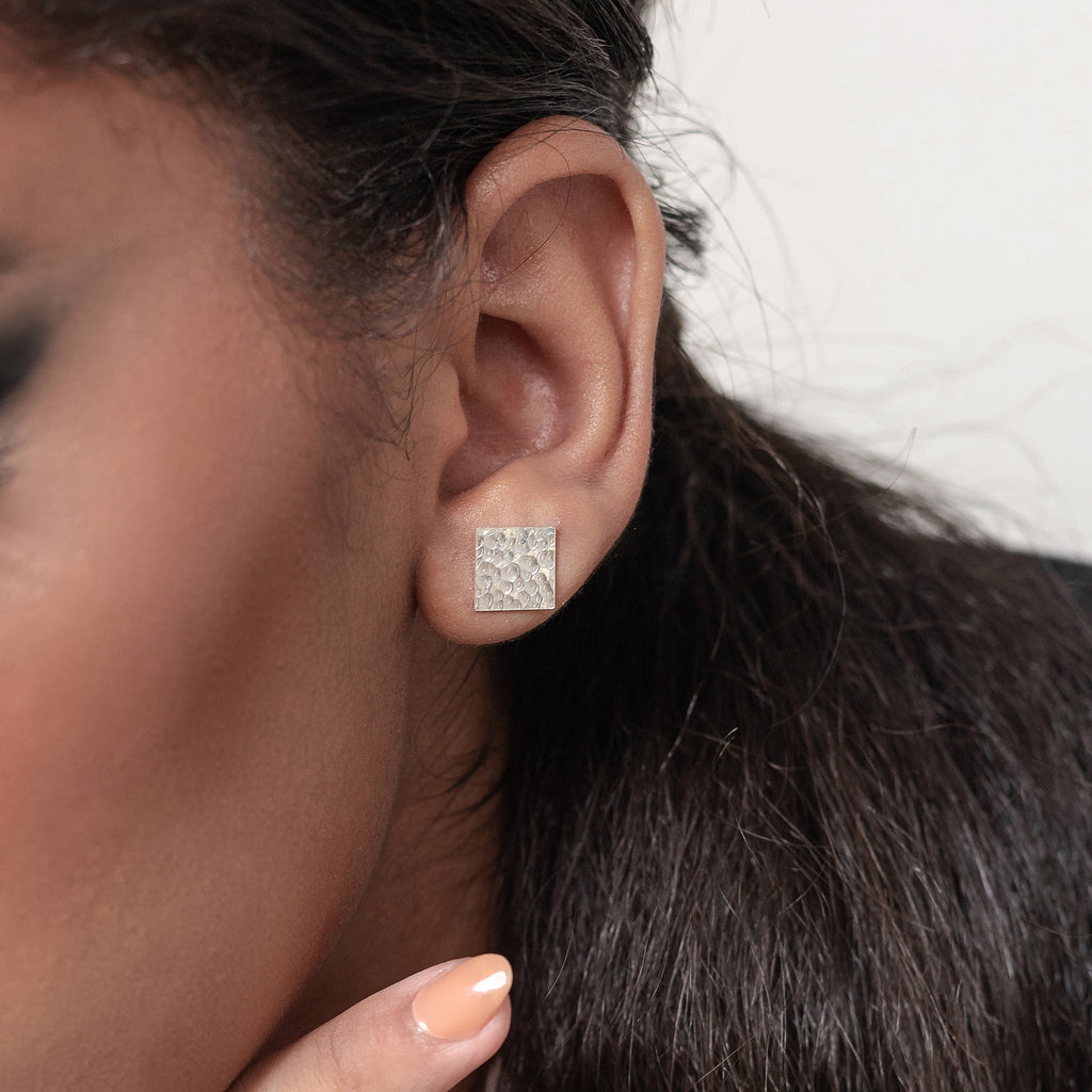 Our reinvented Fledged Pool Earrings hold our signature crushed stone technique and a newly incorporated hammered texture to mimic the surface of a pool. As a call for disconnecting to reconnect, the pool symbolizes relaxation and reflection, highlighting the importance of leisure time for a person's well-being. Tones of a pool during daylight are reflected through the aquamarine Kyanite stones, sunset hues are reflected through the purple Amethyst stones, and late night tones are reflected through black Onyx stones.