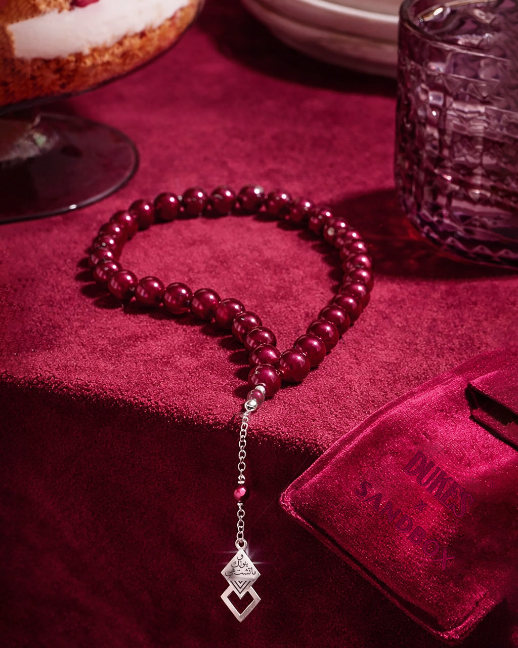 In Collaboration with Dukes, we present hand crafted prayer beads in Ruby Agate semi-precious stones and Sterling Silver 925, shaped in the iconic Sandbox double rhombus and engraved with